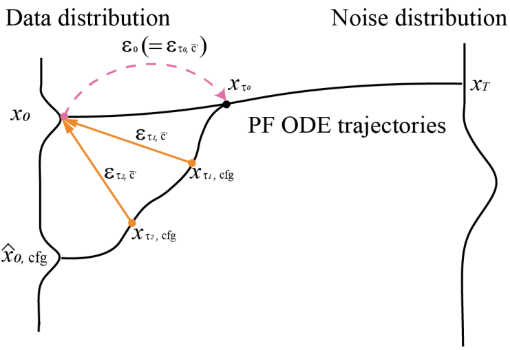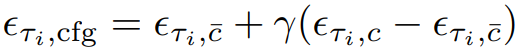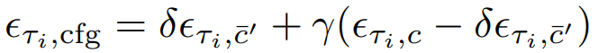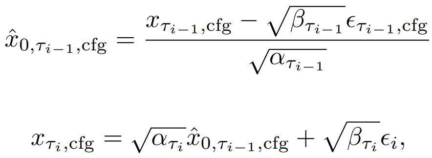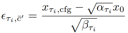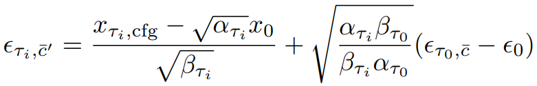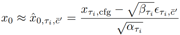 이때, 중복성이 높고 추가 U-Net계산이 필요한 CFG의 negative conditioning c̄를 계산하는 대신에, 다음과 같이 가상의 잔차 노이즈 ϵτi,c̄'과 xτi,cfg에서 x0를 예측할 수 있는 가상의 negative condition embedding c̄'을 가정한다.