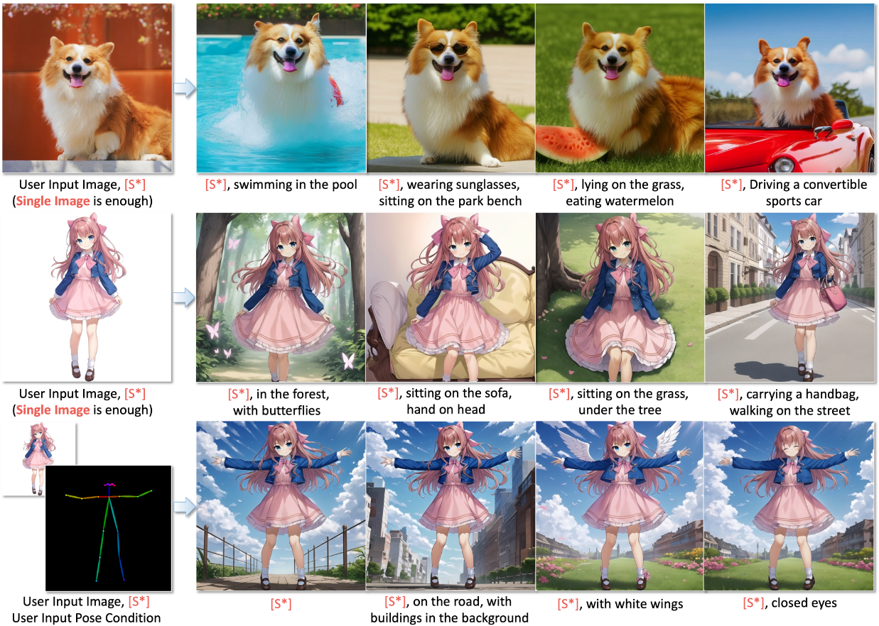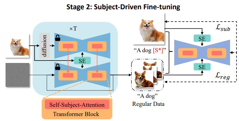 먼저 정규 이미지를 생성하고 페어링 데이터 {Rerference image, "A class word [S*]"}, {Regular image, "A class word"}를 구축하여 fine-tuning에 사용한다.