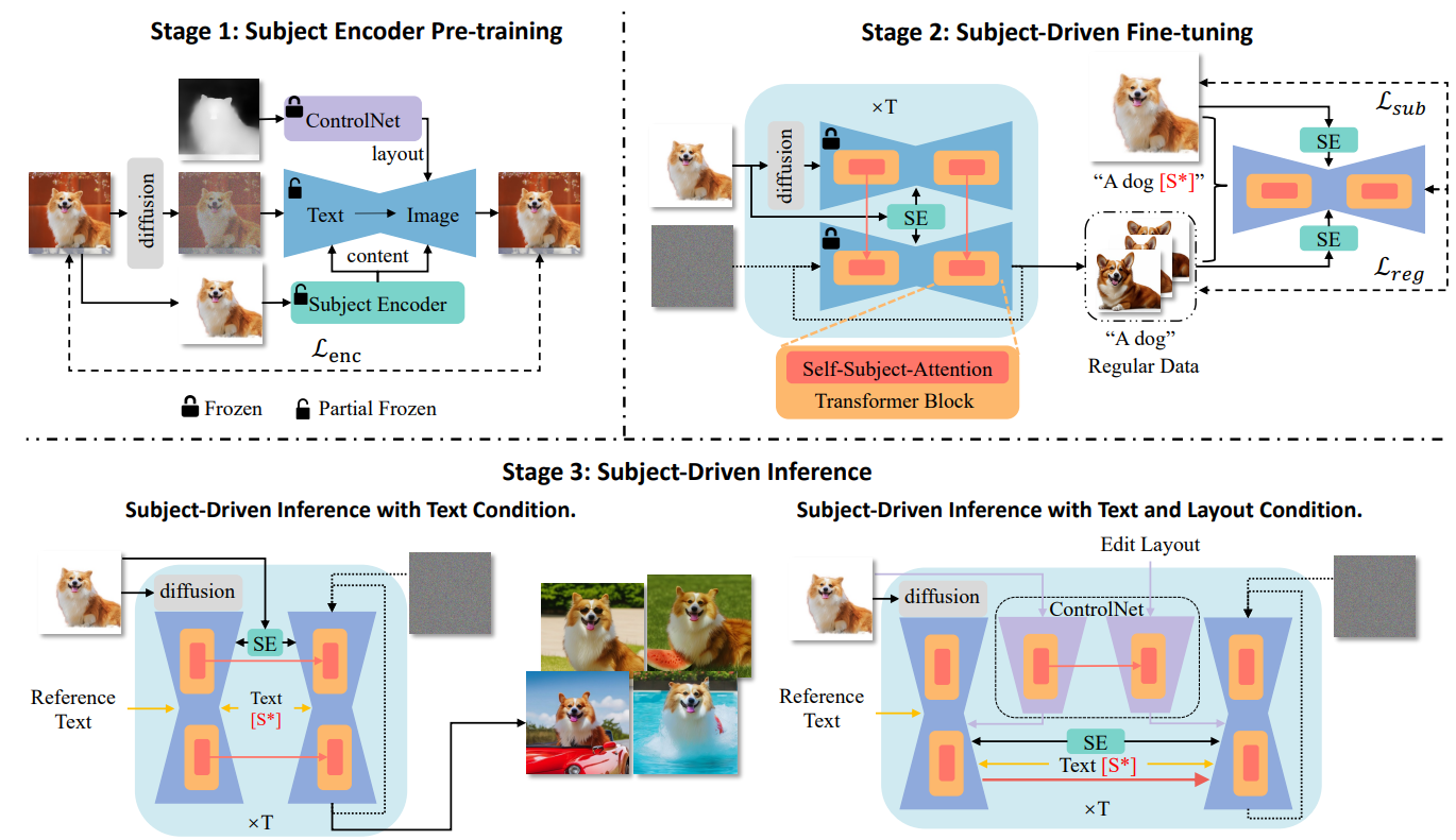 또한 overview의 stage-1과 같이 동결된 ControlNet으로 layout을 제공하여 subject encoder가 layout 보다는 content에 더 집중할 수 있도록 훈련한다.