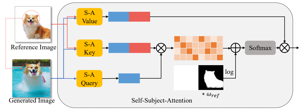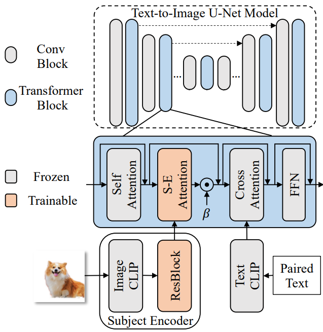 U-Net의 transformer block에 Subject-Encoder Attention 추가. S-E Attention은 cross-attention과 동일하고 0으로 초기화된다.
