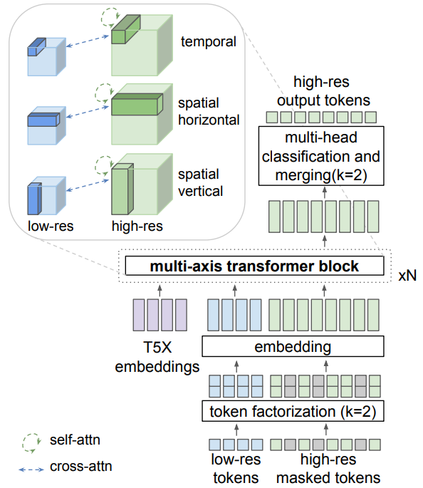 Autoregressive transformer를 통해 고해상도 비디오를 생성하는 경우 토큰 길이로 인해 매우 비실용적이므로 spatial super-resolution non-autoregressive video transformer를 개발한다.