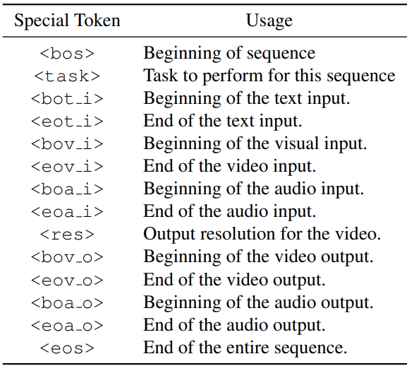 LLM은 text, video, audio token을 입력으로 visual, audio token을 출력하며 prompting을 위한 특수 토큰은 다음과 같다.