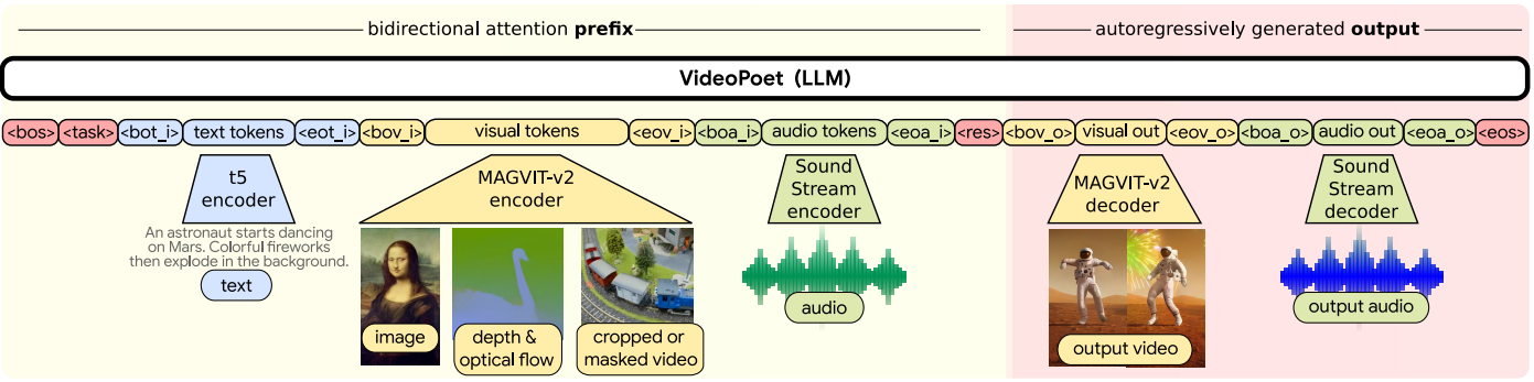 VideoPoet은 각 양식을 이산 토큰으로 출력하는 decoder-only LLM architecture를 사용한다.
