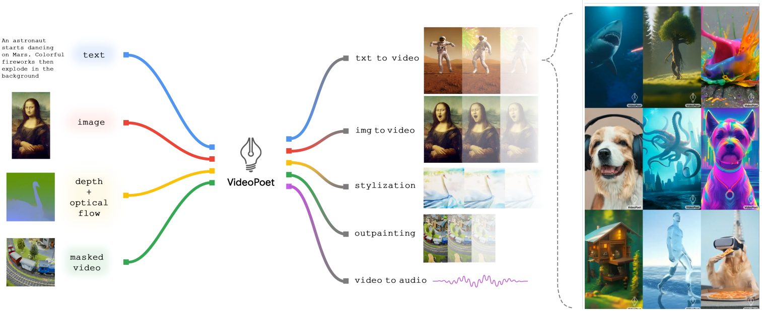 Multi-modal 입력을 처리하고 고품질 audio, video를 합성할 수 있는 VideoPoet 제안