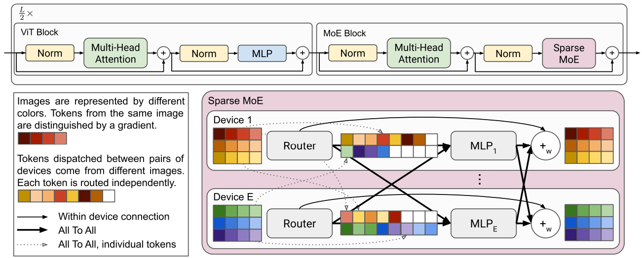 위 그림이 좀 헷갈릴 수 있는데, 계산 효율성을 위해 배치 이미지들을 각 분산 장치에 입력하고, MoE layer에서 토큰의 출신 이미지와 상관없이 같은 전문가에 할당된 토큰끼리 모아서 연산 후 다시 같은 이미지 출신끼리 묶는다.