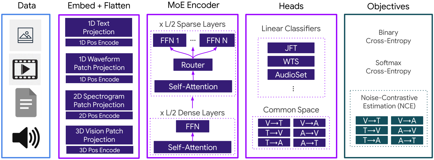 각 임베딩은 modality에 관계없이 공유 인코더에 입력되고 인코더는 LIMoE의 설계를 따른다. 해당 설계는 특정 modality를 추가해도 인코더를 변경할 필요 없음.