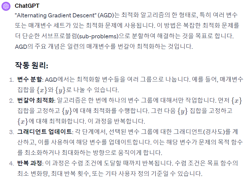 jax.jit API를 통해 AGD를 구현하여 해결한다. 해당 논문에서 각각의 최적화 단계가 개별적으로 볼록한 경우 AGD가 수렴으로 이어질 수 있음을 입증했다.