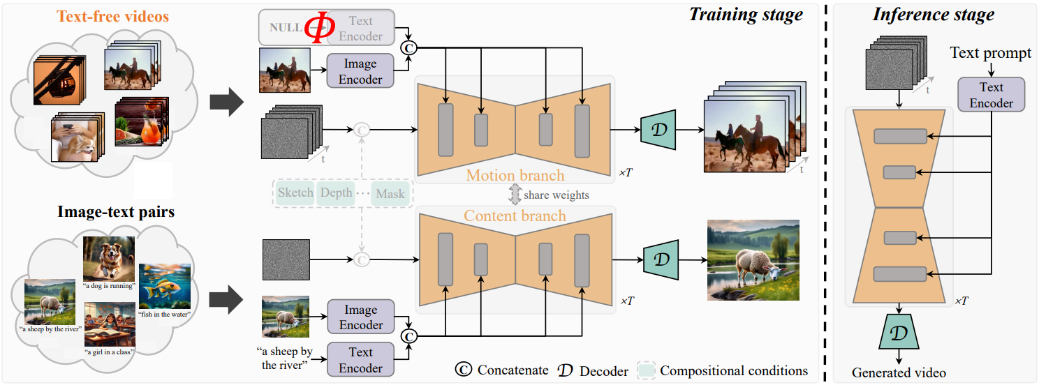 Youtube와 같은 동영상 플랫폼에서 텍스트 없는 고품질 비디오를 수집하고 중앙 프레임을 조건으로 하여 image-to-video 작업에 대해 훈련한다.