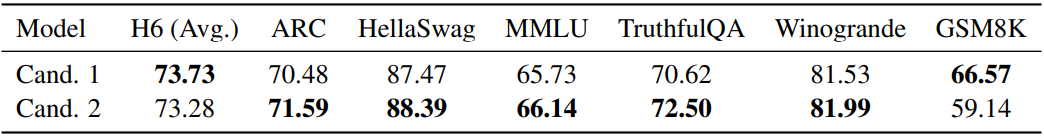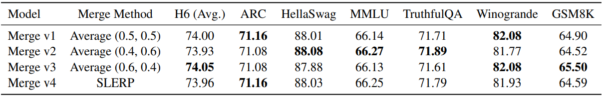 Instruction tuning, alignment tuning에서 훈련된 일부 모델을 가중치 평균 or Spherical Linear Interpolation을 통해 병합하였다.