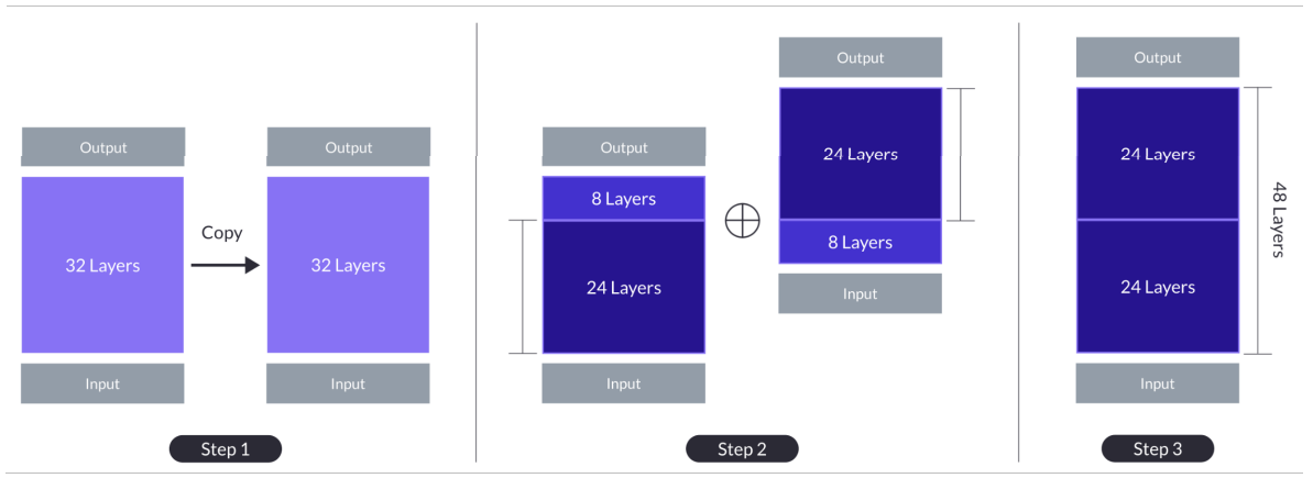 모델 up-scaling의 순진한 방법은 계층을 복사하여 단순히 쌓는 것이다. 32계층을 복사하여 64계층으로 만든다. 하지만 이러한 방법은 계층 거리가 멀기 때문에(1 ↔ 32) 모델의 능력을 방해할 수 있다.