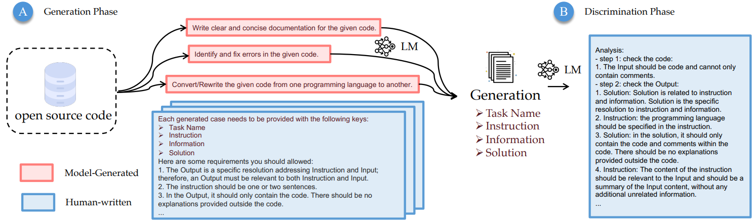 광범위한 unsupervised open source code를 활용하여 supervised instruction data를 생성할 수 있는 새로운 LLM 기반 Generator-Discriminator Framework를 제안한다.