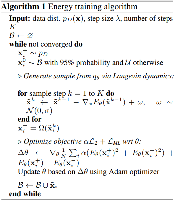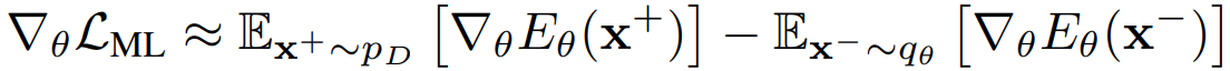 또한 pθ의 근사치인 qθ로부터 음의 샘플 최적화: E와 Langevin dynamics로부터 샘플링된 음의 샘플