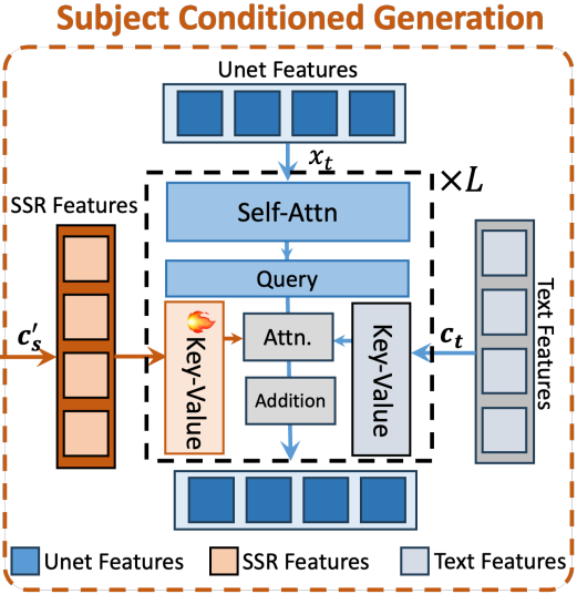 Text condition의 cross-attention과 독립적으로 해당 레이어의 학습 가능한 복사본을 사용하여 subject embedding을 집계한다.