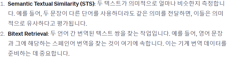 대칭 작업의 경우 semantic textual similarity (STS), bitext retrieval 시나리오를 살펴본다.