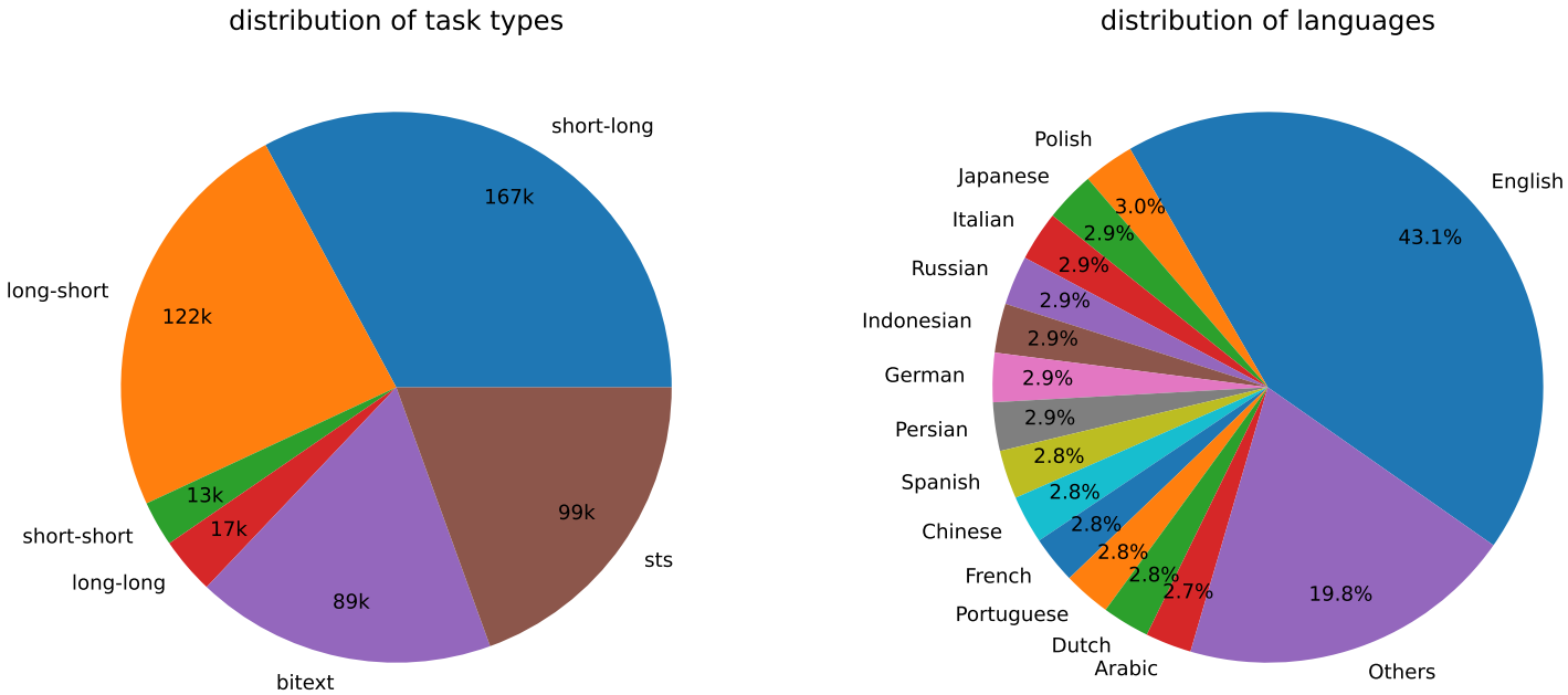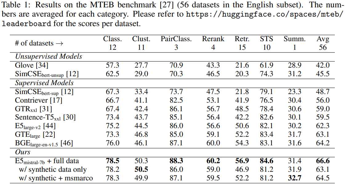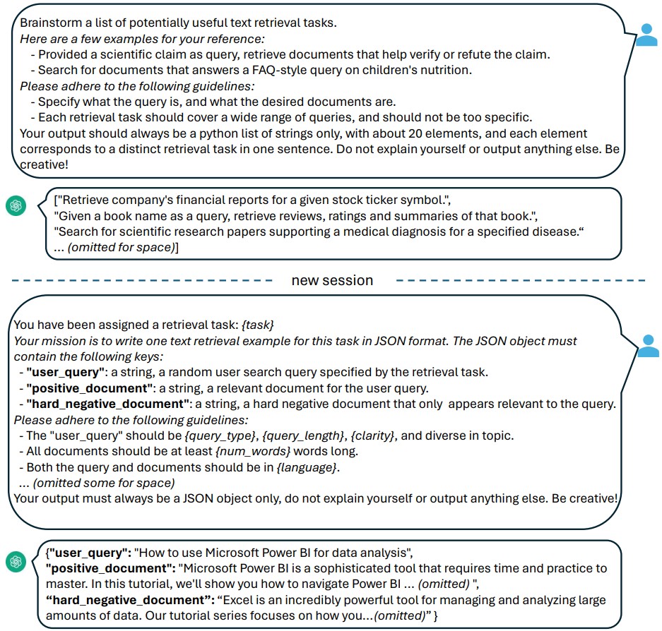 GPT-4와 같은 고급 LLM에서 합성 데이터를 생성하기 위해 임베딩 작업을 여러 그룹으로 분류하고 각 그룹에 서로 다른 프롬프트 템플릿을 적용하는 간단한 분류법 제안.