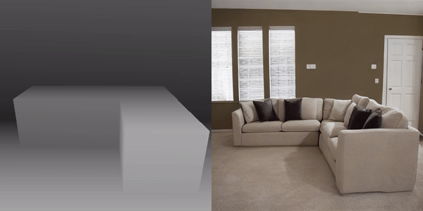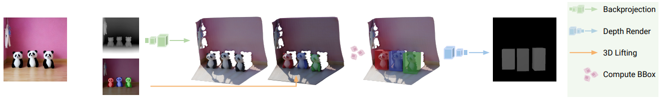 먼저 위와 같은 depth estimator와 SAM을 사용하여 depth map과 segmentation map을 얻는다. 각 image segment에 대해 depth map을 사용하여 3D point cloud로 역투영한 뒤 최소한의 부피로 3D 경계 상자를 추정하고 직육면체 mesh로 표현한다. 그런 다음 역투영에 사용된 원본 카메라 피라미터를 사용하여 box scene을 렌더링하고 depth map을 추출한다.