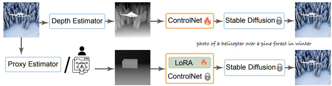 ControlNet의 깊이 제어는 다음과 같이 depth map D가 주어지면 생성 이미지 I를 깊이 추정기 f에 입력했을 때 D와 같도록 한다.