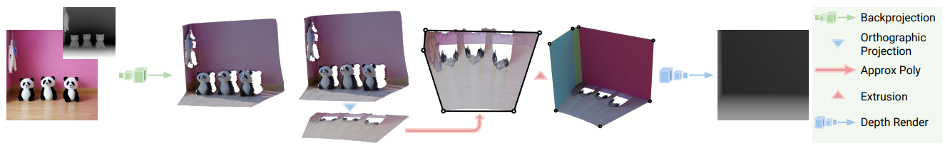 먼저 기성 monocular depth estimator를 사용하여 depth map을 추정한 다음 3D triangular mesh로 역투영하고 직교 투영을 사용하여 수평면에 투영한다. 그런 다음 수평면을 다각형으로 근사하고 벽을 돌출시키고 원본 카메라 view에서 깊이를 렌더링하여 depth map D를 얻는다.