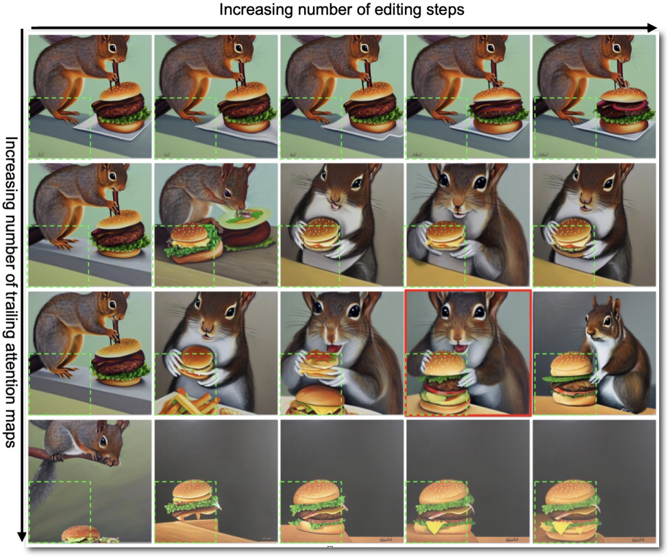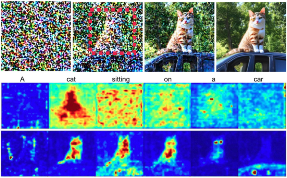 아래 두 줄은 각각 처음과 마지막 denoising process의 cross-attention map을 보여준다.