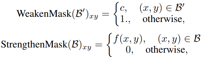 StrengthenMask는 f(본문에서는 Gaussian window)를 사용하여 bbox 내부의 attention을 증가시키고 WeakenMask는 나머지 영역의 attention을 감쇠한다.