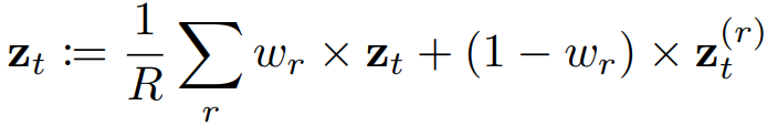 여러 개체를 생성하려는 경우 각 개체 zt(r)을 개별적으로 생성한 뒤 원래의 프롬프트 P에 대한 latent zt와 선형 보간 후 평균화한다.