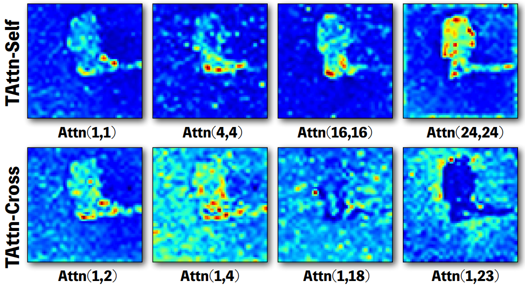 Temporal attention에 대한 분석을 보면 temporal cross-attention은 프레임 간의 거리가 멀어질수록 전경보다는 주변의 배경에 더 많은 집중을 하는 것을 볼 수 있다.