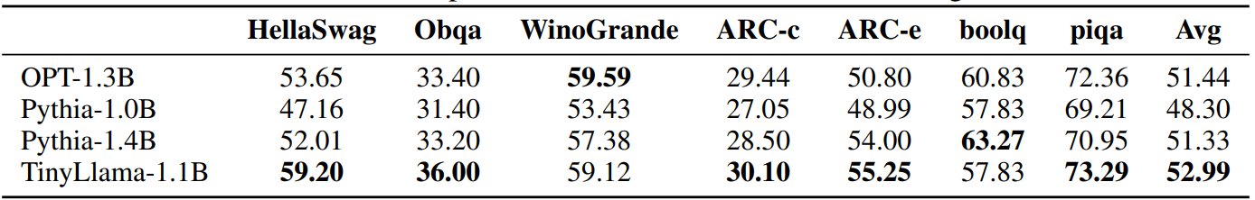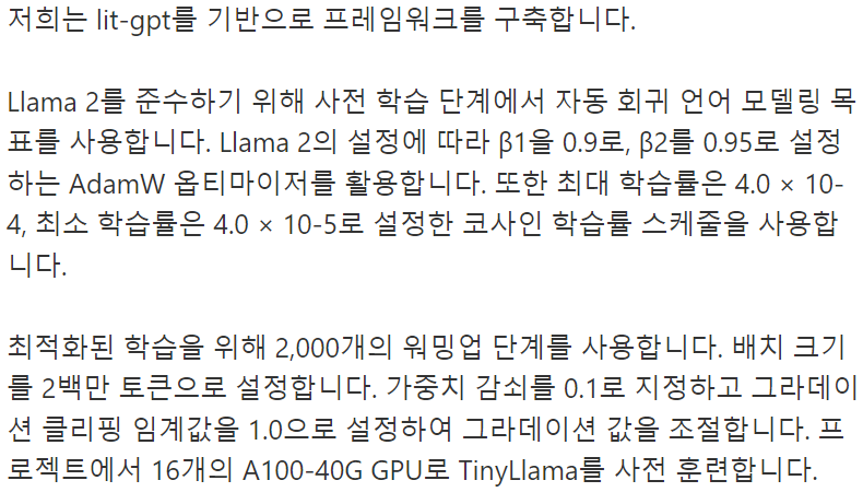 LLaMA2의 architecture, tokenizer를 기반으로 3 epochs에 걸쳐 1T 개의 토큰으로 pretraining 된 1.1B 언어 모델인 TinyLlama 소개