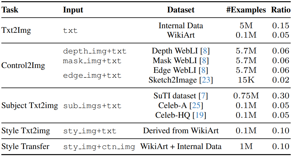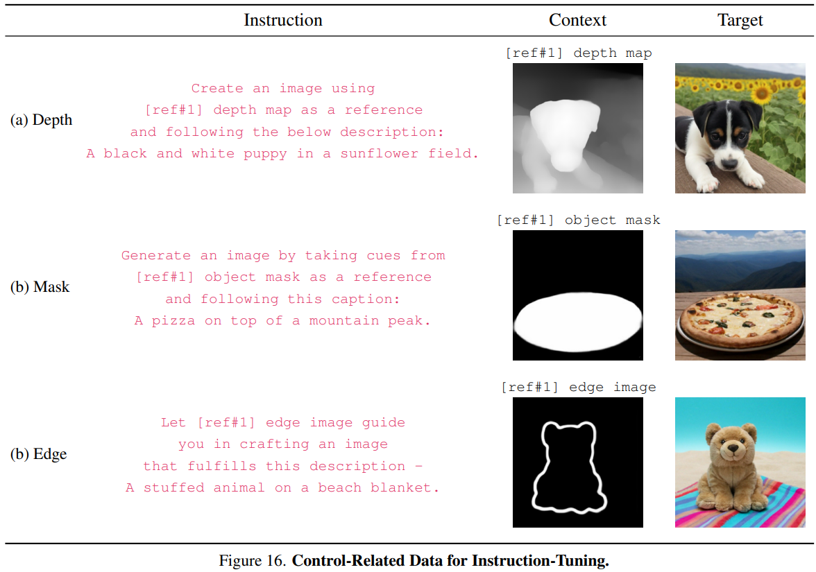 Instruction tuning을 위한 11개의 추가 데이터셋(e.g. depth map, edge map)과 5개의 작업 범주를 구성하고 GPT-4를 통해 데이터셋 당 100개의 다양한 명령어 템플릿을 구성하도록 했다.