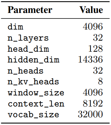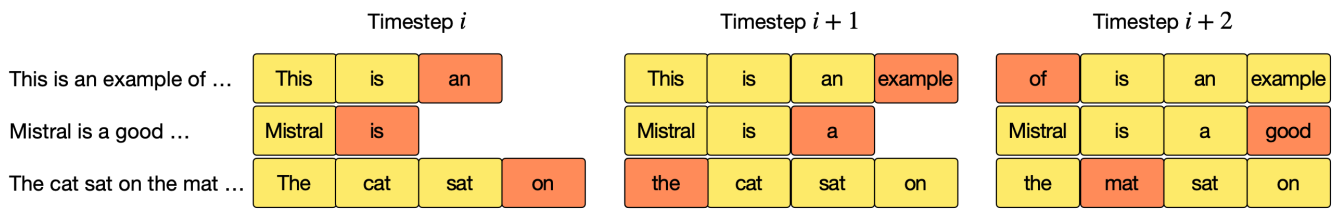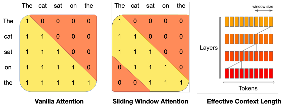 Window size W개의 이전 토큰에 대해 attention을 수행한다. 이전 토큰은 또다시 이전 레이어에서 이전 토큰에 대한 attention을 수행하므로 마지막 레이어의 토큰은 최대 약 13만개(4096x32) 토큰의 영향을 받는다.
