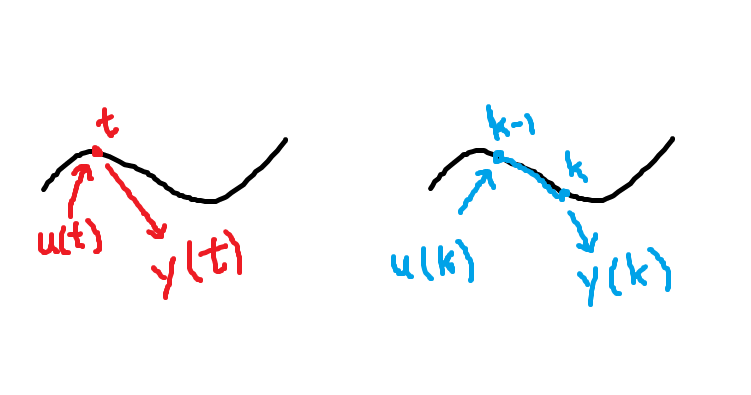 주의할 점은, 연속 시간에서는 현재 상태 x(t)를 사용하여 y를 계산했지만