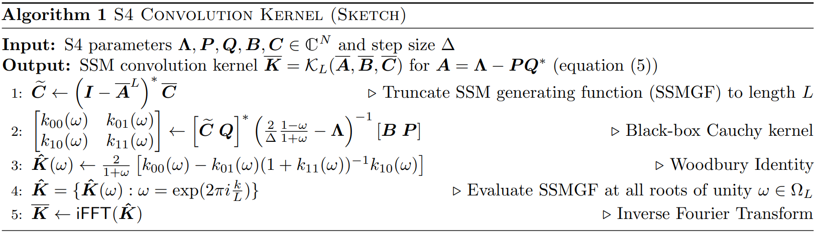 결국 이 논문의 목적은 S4 피라미터화를 통해 Ā, B̄, C̄, K̄를 효율적으로 계산하는 것이다.