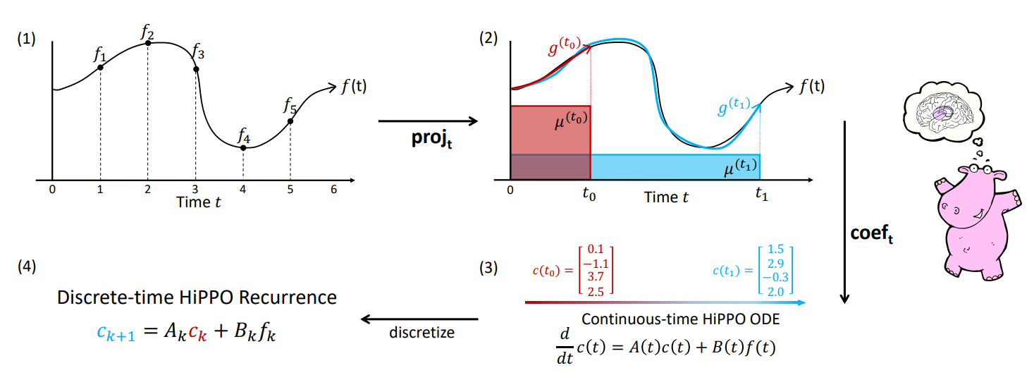 HiPPO는 모든 시간 t에 대해 0~t 시간에 대한 정보의 종합이라고 볼 수 있는 ct를 유지하기 위한 프레임워크이다.