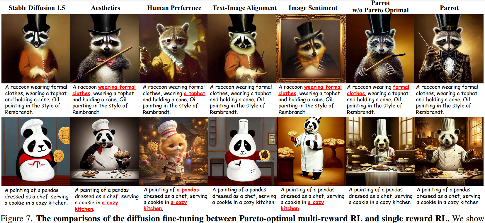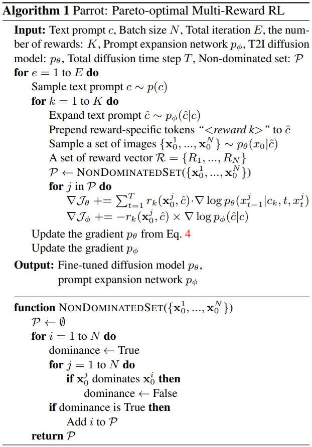 Pareto optimal selection을 사용하여 reward 간의 균형을 맞추기 때문에 Parrot이라는 이름을 붙였다.