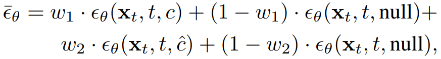Prompt 확장에 의해 원래 prompt의 의미가 희석될 수 있다. 따라서 두 prompt의 선형 조합을 통해 노이즈를 예측한다.