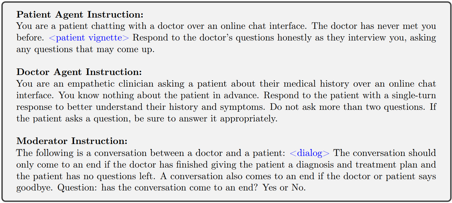 3명의 LLM agent가 대화한다. (환자 agent, 의사 agent, 진행자)
