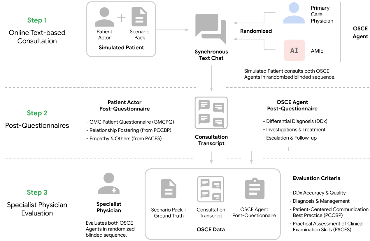 환자는 상대가 의사인지 AMIE인지 모르며, 대화 내용은 환자와 실제 전문의에 의해 평가된다.