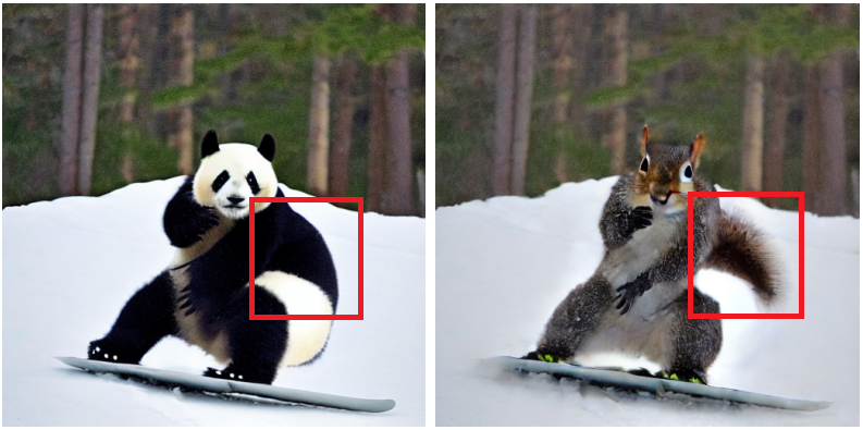 따라서 prompt y에 대한 이미지를 생성하려는 DM과, ẑ과 비슷한 이미지를 생성하려는 θ의 줄다리기가 되고, 다음 그림의 다람쥐꼬리 부분처럼, 두 feature가 비슷하다고 속이게 된다.