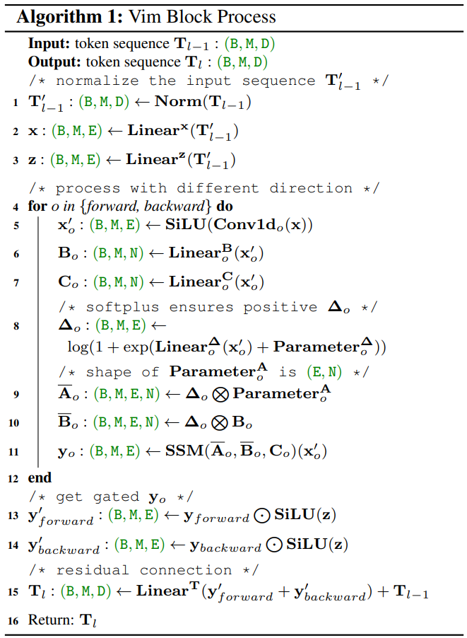 기존 Mamba와 유일한 차이점은 토큰 시퀀스를 역방향으로 모델링할 수 있는 backward branch의 유무이다.