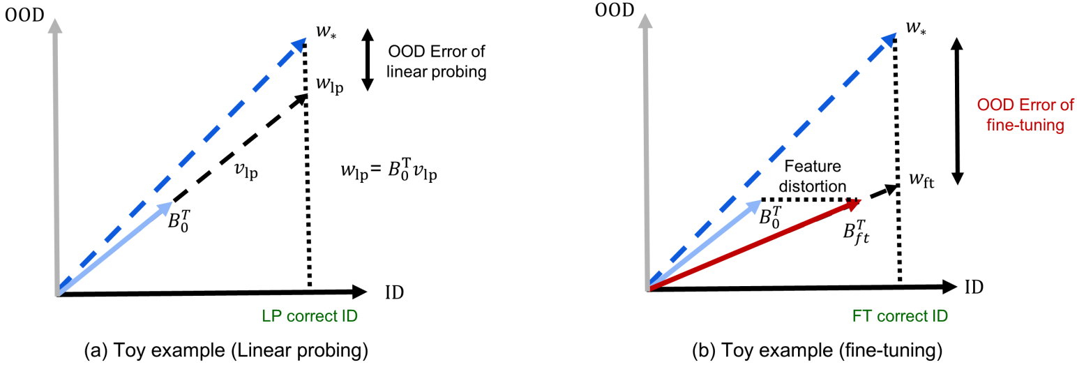 반면에 fine-tuning에서는 extractor가 ID 분포를 따라 업데이트되어 큰 OOD error를 발생시킨다.