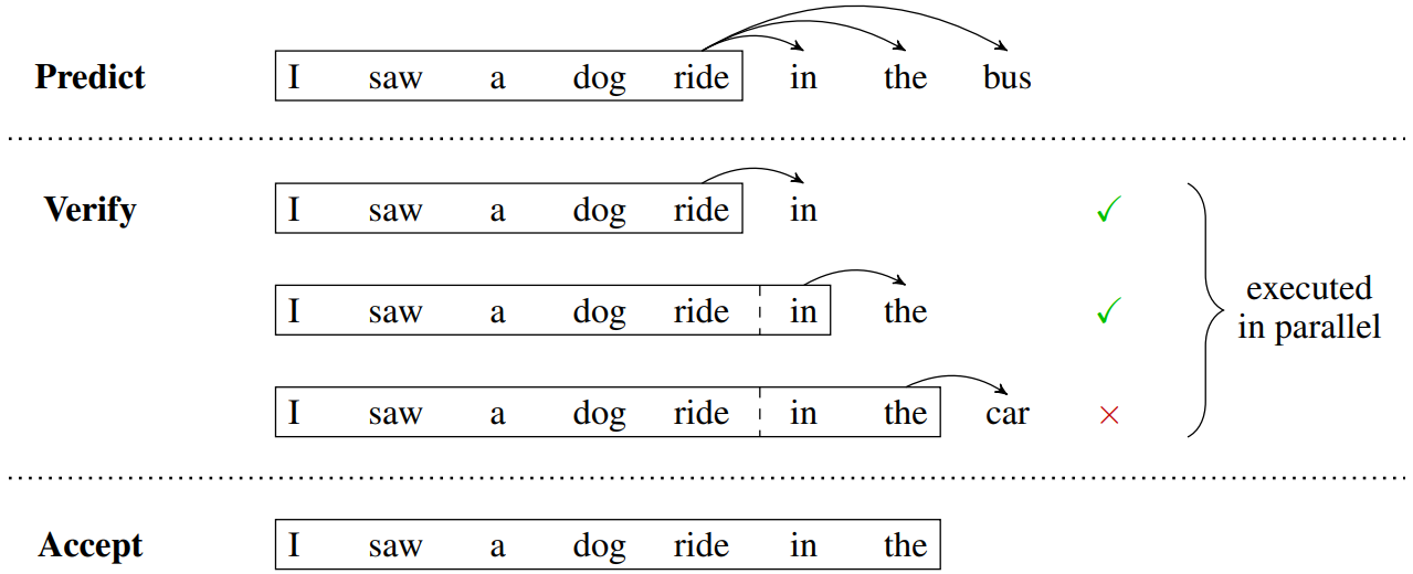 Speculative Decoding에 따라 생성되는 시퀀스의 길이 결정에 수용-거부 메커니즘을 사용한다.