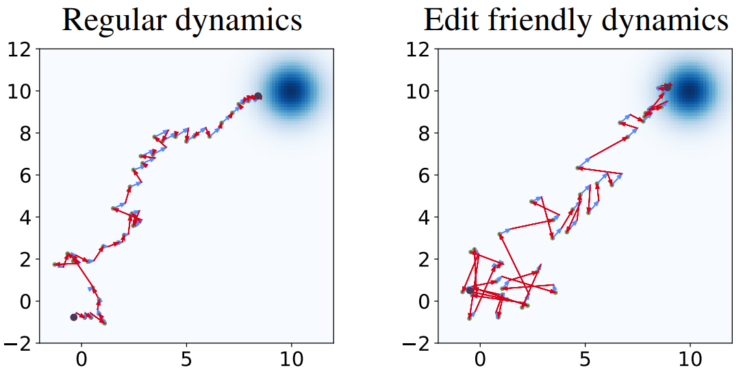 파란색은 DDPM 추론, 빨간색은 노이즈 섭동이다. 오른쪽의 노이즈 섭동이 훨씬 큰 것을 볼 수 있다.