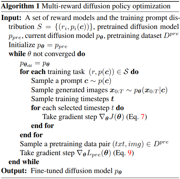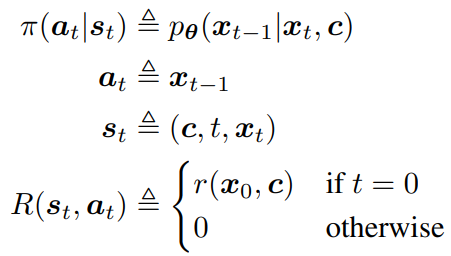 Denoising process를 정책으로 취급하고 최종 결과물에만 보상을 준다.