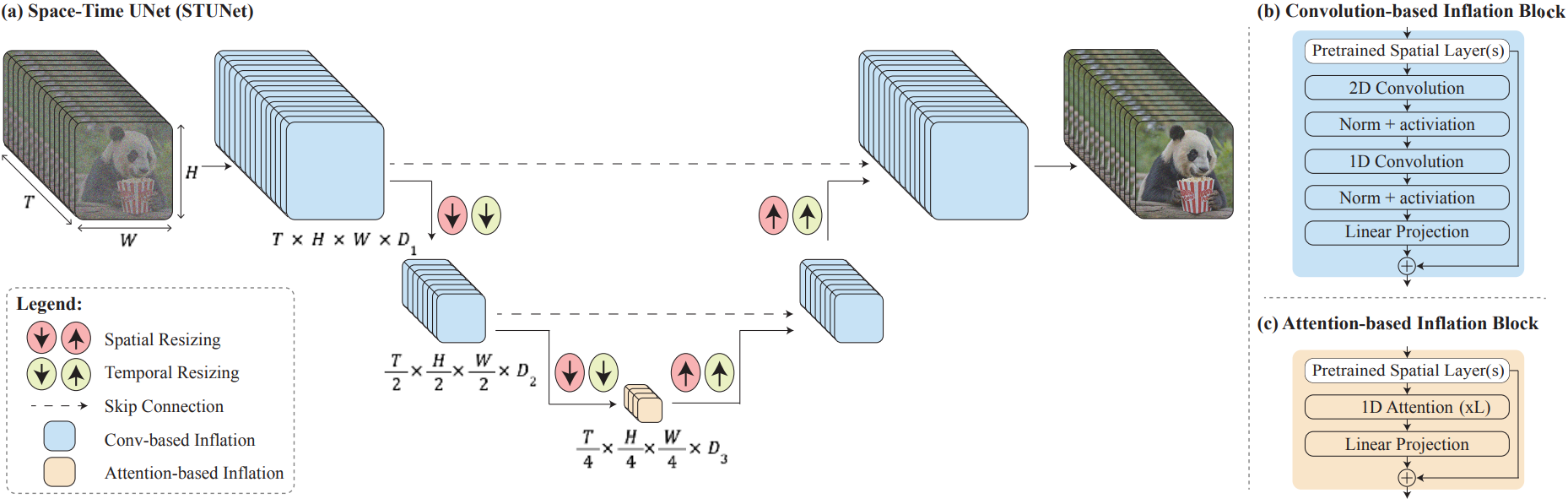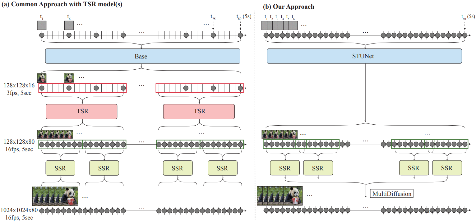 STUNet을 통해 모든 프레임을 한 번에 생성하고 MultiDiffusion을 통해 super-resolution 한다.