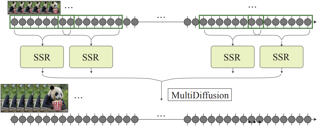 생성된 비디오를 중첩된 i segments로 나누고 시간축을 따라 MultiDiffusion을 적용한다.