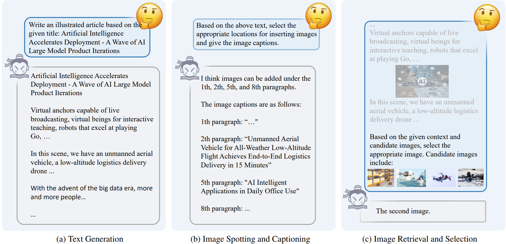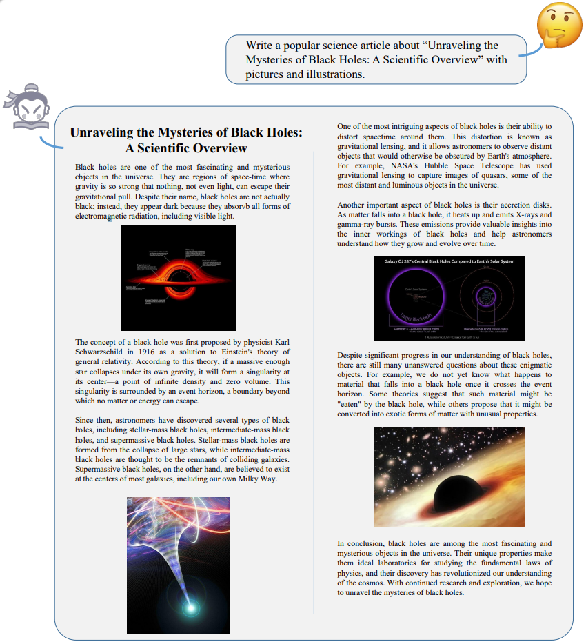 인터넷에서 수집한 interleaved image-text composition을 포함하는 데이터셋과 GPT-4를 통해 생성한 지침을 활용하여 모델이 article의 초안을 생성하고, 적절한 위치에 이미지 캡션을 생성하고, article 내 이전 텍스트와 이미지를 고려하여 적절한 이미지를 선택할 수 있게 훈련되어 최종적으로 다음과 같은 article을 생성할 수 있게 된다.