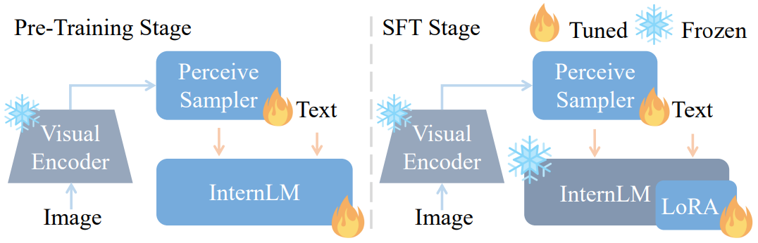 Interleaved, paired multi-modal data와 LLM의 성능을 유지하기 위해 InternLM의 사전 훈련에 사용된 텍스트 데이터 일부를 포함한 dataset에서 다음 토큰을 예측하도록 훈련.