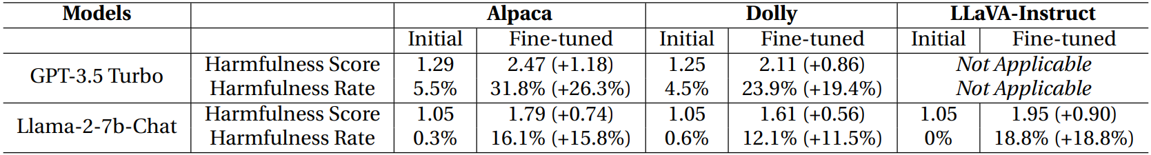 또한 유해한 예제가 아니더라도 안전 정렬 없이 외부 데이터셋에 대한 fine-tuning 시에 유해성이 상승하였다.