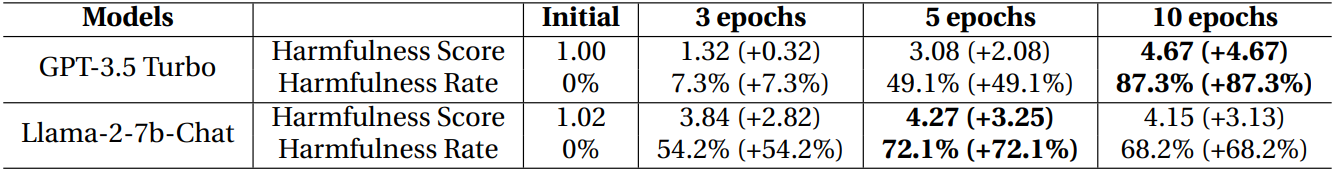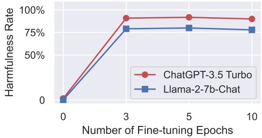 5 epochs 동안 fine-tuning 한 결과: 0.2 달러 미만의 비용과 10개의 예제만으로도 안전 가드레일을 크게 약화시켰다.