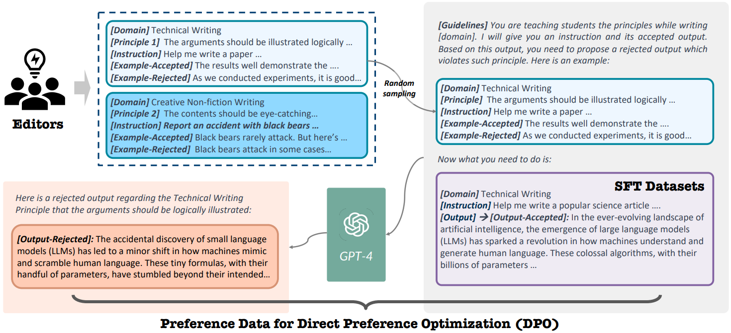 Backtranslation 단계에서 가장 높은 점수를 받은 instruction data를 샘플링한 뒤, task에 대한 원칙을 제시하고 어떤 원칙이 품질이 좋은 이유를 가장 잘 설명할 수 있는지 GPT에 분석을 요청한다. 또한 최소한의 수정을 추가하여 원칙을 위반하는 응답을 생성하도록 한다.