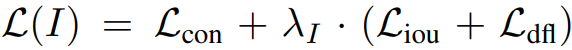 또한 IoU, Distribution Focal Loss 추가. 입력 이미지 I가 image-text data에서 나온 경우 노이즈가 많으므로 λ = 0